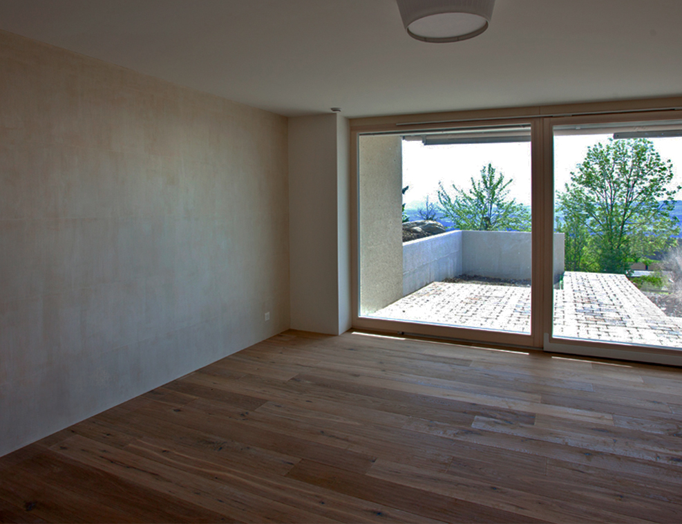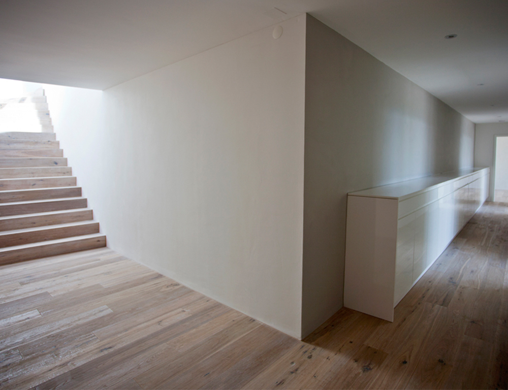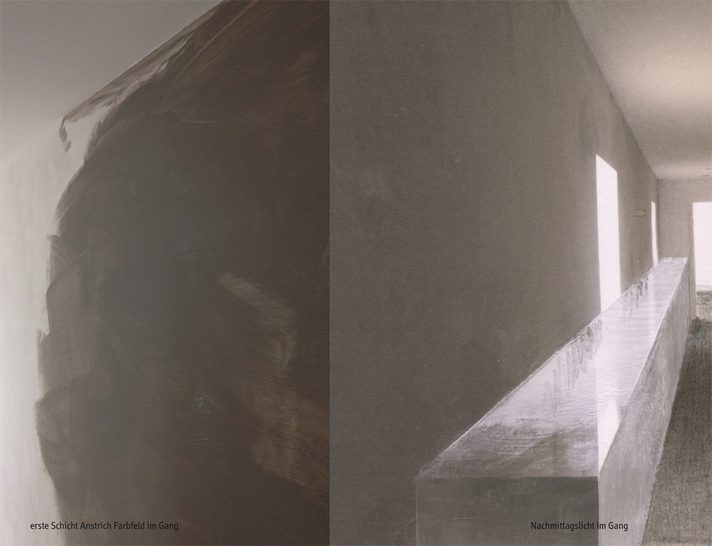 Der neue Schlaftrakt unter dem Einfamilienhaus ist halb im Erdreich. Eine Wand im Werkraum ist mit glänzender Ölfarbe gestrichen, Gutshofgelb. Da er fensterlos ist, wird sein Tageslichtbedarf über einen Lichtschlitz in der Decke gespiesen. Farblich gelb getöntes Licht spiegelt sich so in den Raum. Das Experiment klappt, Farbe, Anstrich kann als eine Art Lichttransporter verwendet werden.