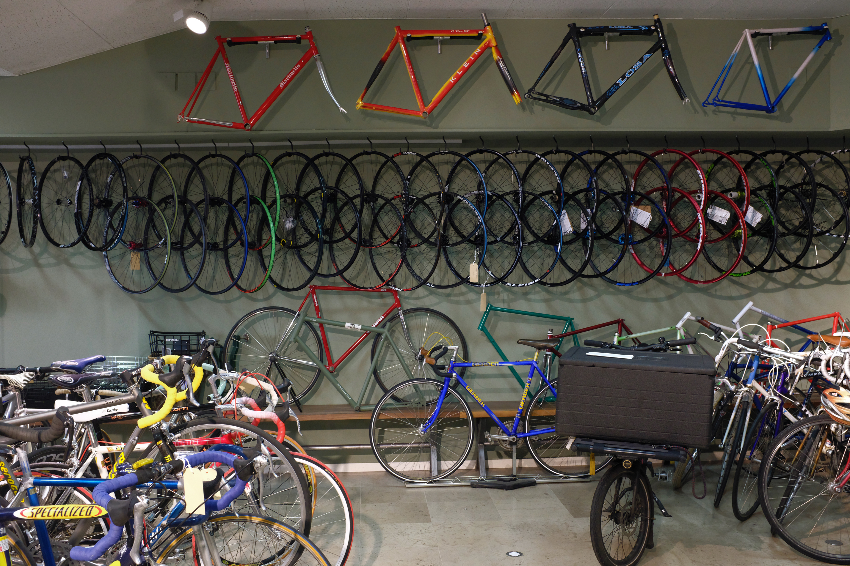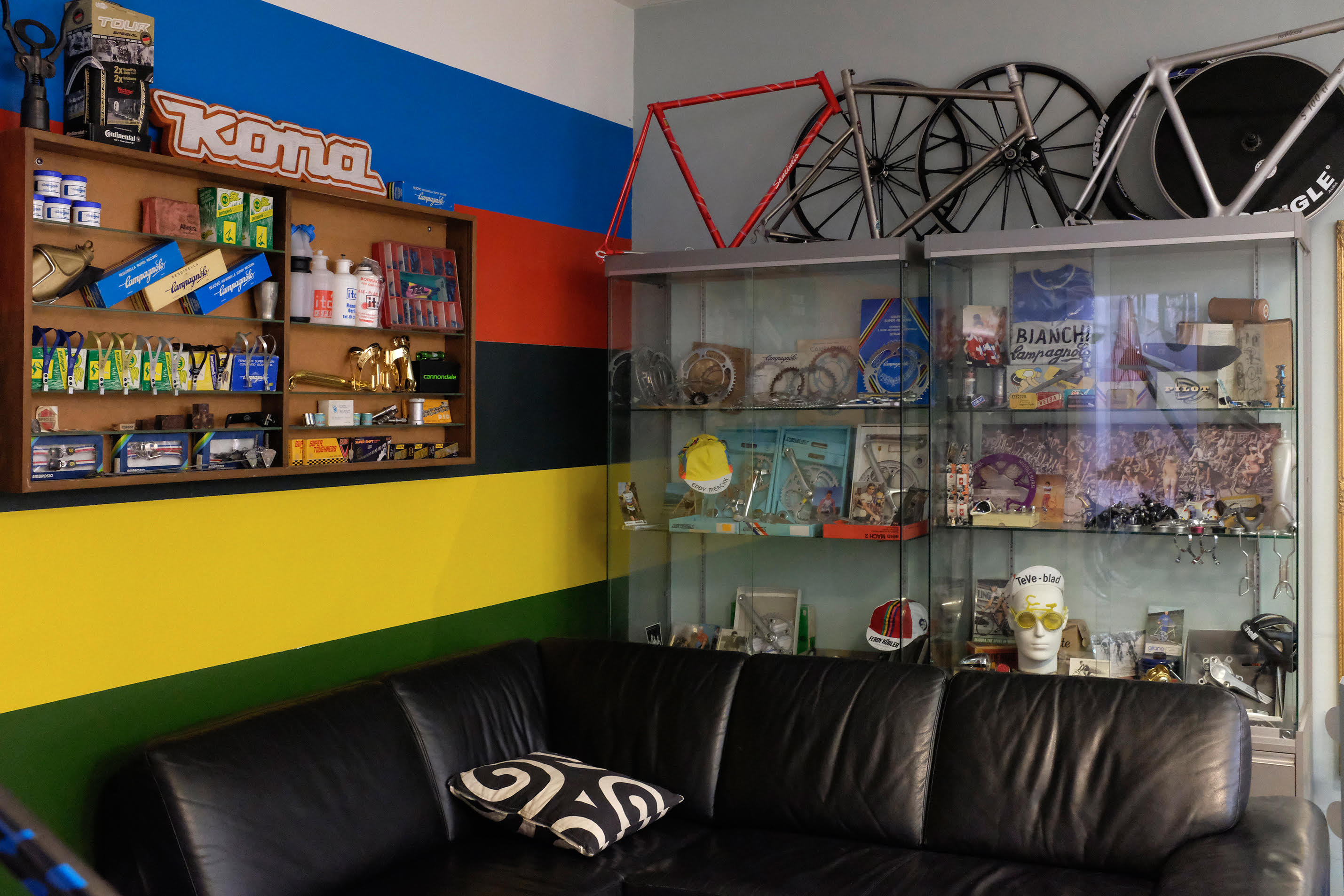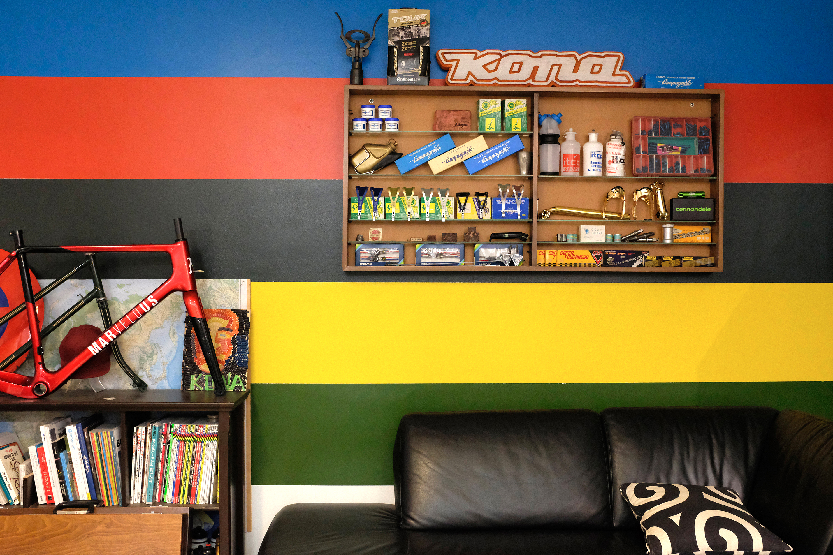 Ein grosser Verkaufsladen, Werkstatt und Sammlerstücke finden in diesem Lokal zusammen ihren Platz. Auch die Farbigkeit hat sich der Fahrradwelt verschrieben. Die Streifen vom Regenbogentrikot des UCI / ‚Union Cycliste Internationale‘ bringen das Statement gleich wandfüllend. Gegenüber kann das stumpfere Grün all die Fahrradteile aus dem Hintergrund zum glänzen und leuchten bringen. Oder es erscheint wie die Hügel in der Ferne, da draussen wo die Fahrradreise beginnt.